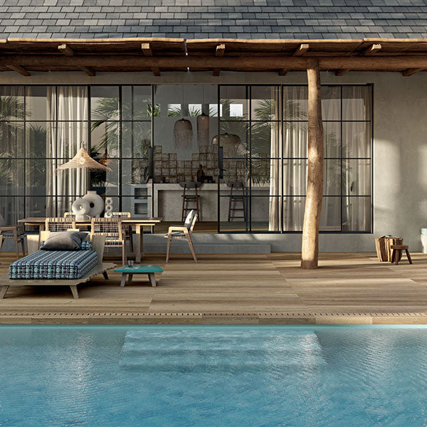 The OUT.20 Poetry Wood tile is a perfect fusion of natural charm and modern resilience for your outdoor areas. This 20mm thick porcelain tile beautifully emulates the warm, golden hues of aged timber, bringing a cosy and inviting atmosphere to patios, terraces, and garden pathways. Its rectified edges ensure a sleek, seamless finish, enhancing the authenticity of its wood-like appearance.
