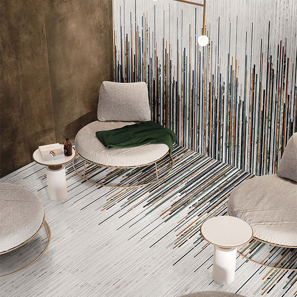 The Sensi Fantasy Sticks tile is a striking blend of artistic design and modern functionality. Featuring varying stripes in different thicknesses, lengths, and colours, this porcelain tile creates a visually captivating, textured effect that brings depth and character to walls, floors, or both.