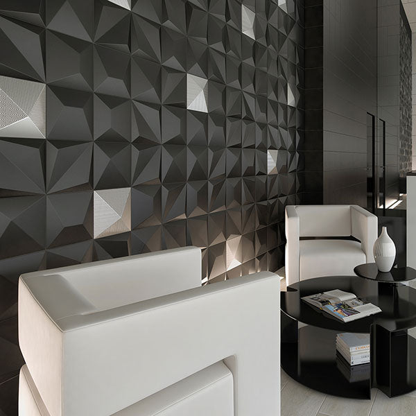 Tile with 3D relief, in the form of a truncated pyramid. In matt-black, allowing for plenty of variation in the way it is used to achieve a play of volumes that accentuate the light.