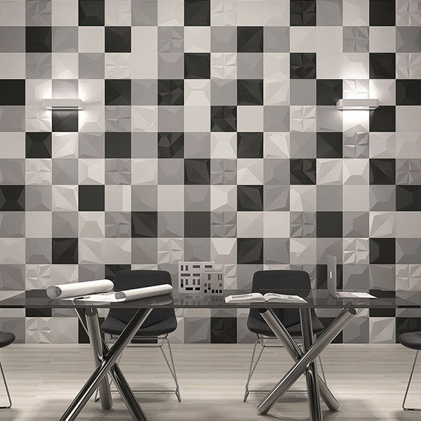 Tile with symmetrical 3D relief, with diagonal division. In matt-grey colour, allowing for plenty of variation in the way it is used to achieve a play of volumes that accentuate the light.