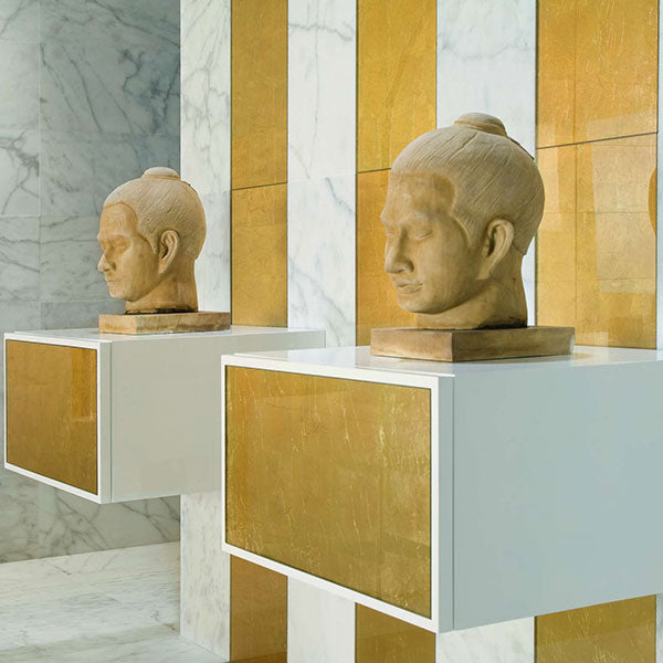 Impressive glass laminated in gold leaf by Dune Ceramics that will give any setting a touch of elegance and sobriety. Ideal for combining with white and marble. There is also a matching glass washbasin.