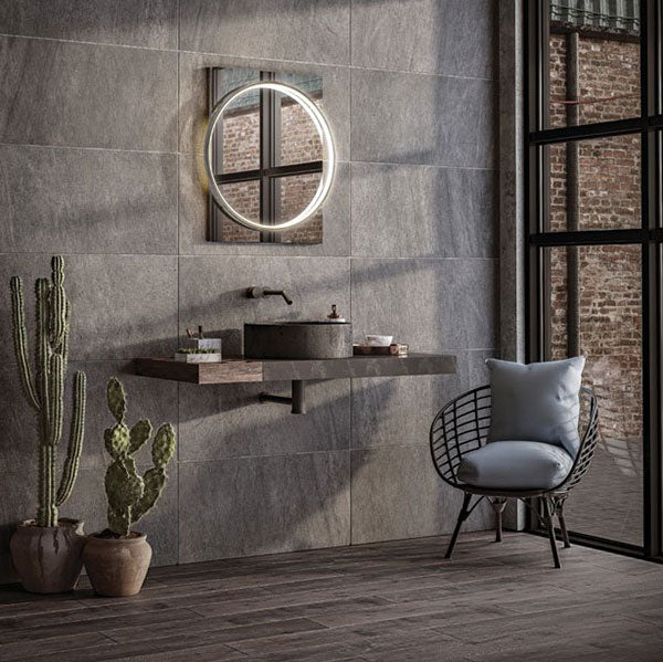 The circular LED light frame is available in chrome or brushed brass with mirrored sides, or in a cutting-edge industrial black. Please allow for the extra 10cm in width on account of the circular frame.