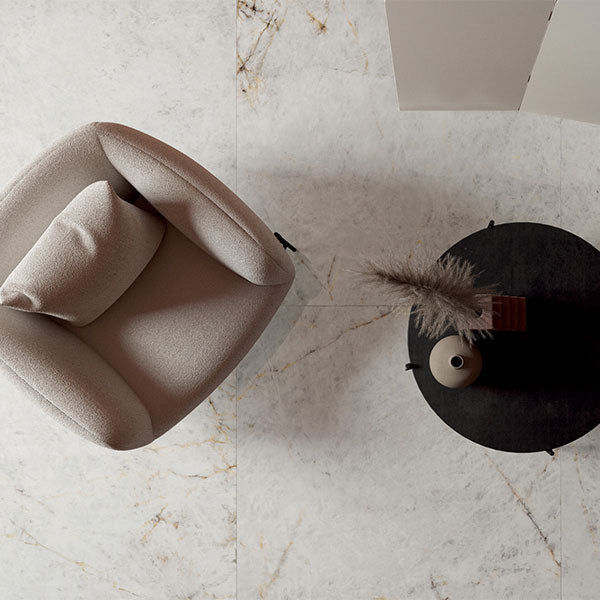 Sensi Gems Crystal tile, sized at an impressive 120 x 120 cm, is a rectified porcelain tile that exudes refined elegance. Its luminous white surface is adorned with delicate veining, introducing subtle golden threads that add warmth and a touch of opulence.