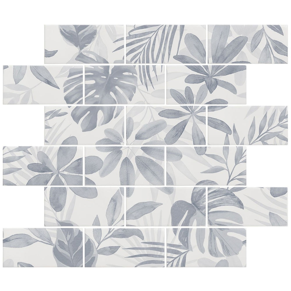 The Jungle Grove Blue panel reimagines tropical elegance in cool blue tones. Composed of 18 ceramic tiles (520 x 520 x 10 mm), this compact square panel brings vivid foliage and painterly detail to life.