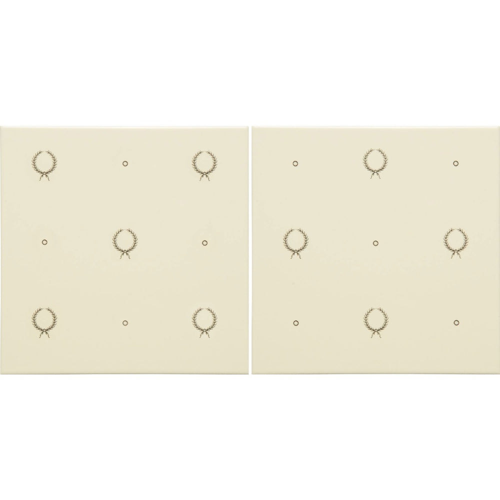 Taken from the Fabergé collection of the Artworks range by Original Style, the Laudatory Wreath 2-Tile Set in Charcoal Grey on County White offers two 152 x 152 x 7 mm gloss decorative ceramic tiles. The design features intricately detailed wreath motifs set against a soft white background.