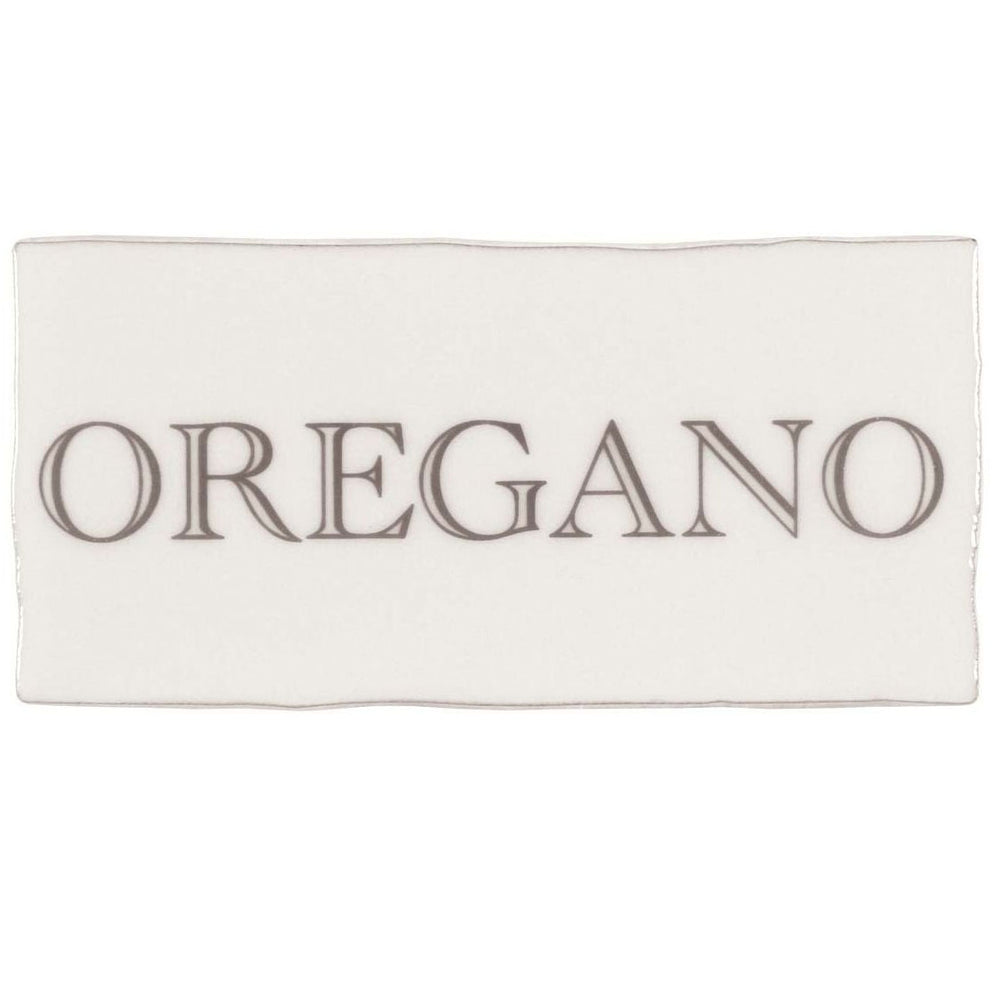 “Oregano in Grey on Cotton” brings a hint of herb-garden elegance into everyday kitchen design. The grey wordmark is crisply printed over a cotton-white ceramic field, size 63x129x10 mm.