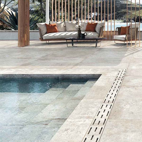 The Debris_2thick Flint tile features a cool grey shade reminiscent of urban landscapes, bringing a contemporary edge to outdoor designs. Its realistic stone texture adds depth and character, making it ideal for modern patios and terraces. With a 20mm thick porcelain build, this tile combines aesthetic appeal with robust performance.