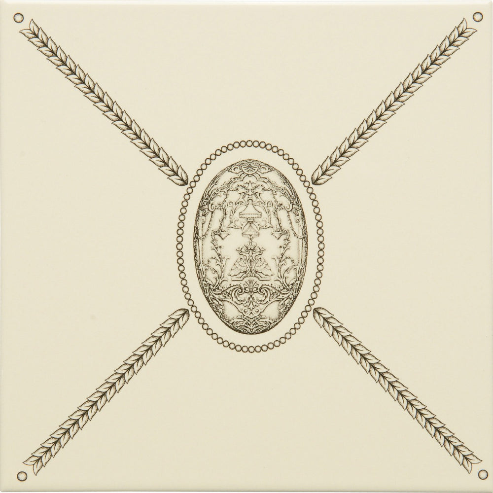This tile from the Fabergé collection in the Artworks range features the Cartouche with Egg motif in charcoal grey over a County White background.