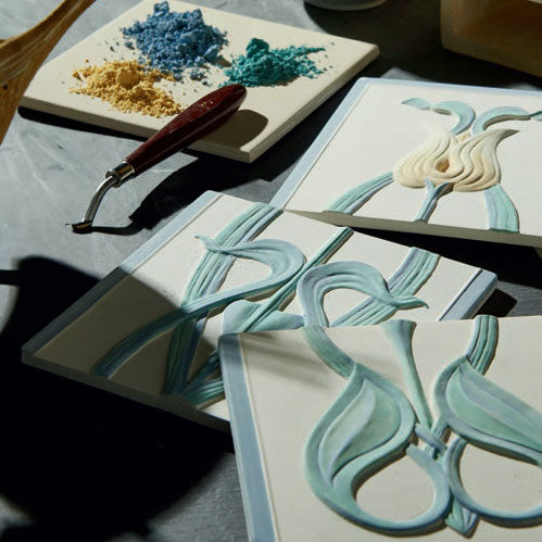 Original Style Artworks Relief Moulded Decor Tiles. With Art Nouveau styling. This 3-tile set is produced by a raised pattern technique called relief moulding. Each tile is slip cast in elegantly sculptured moulds and then dry-fired before being individually hand painted. After glazing and further firing in a high-temperature kiln, the result is a unique piece that will provide pleasure for years to come.