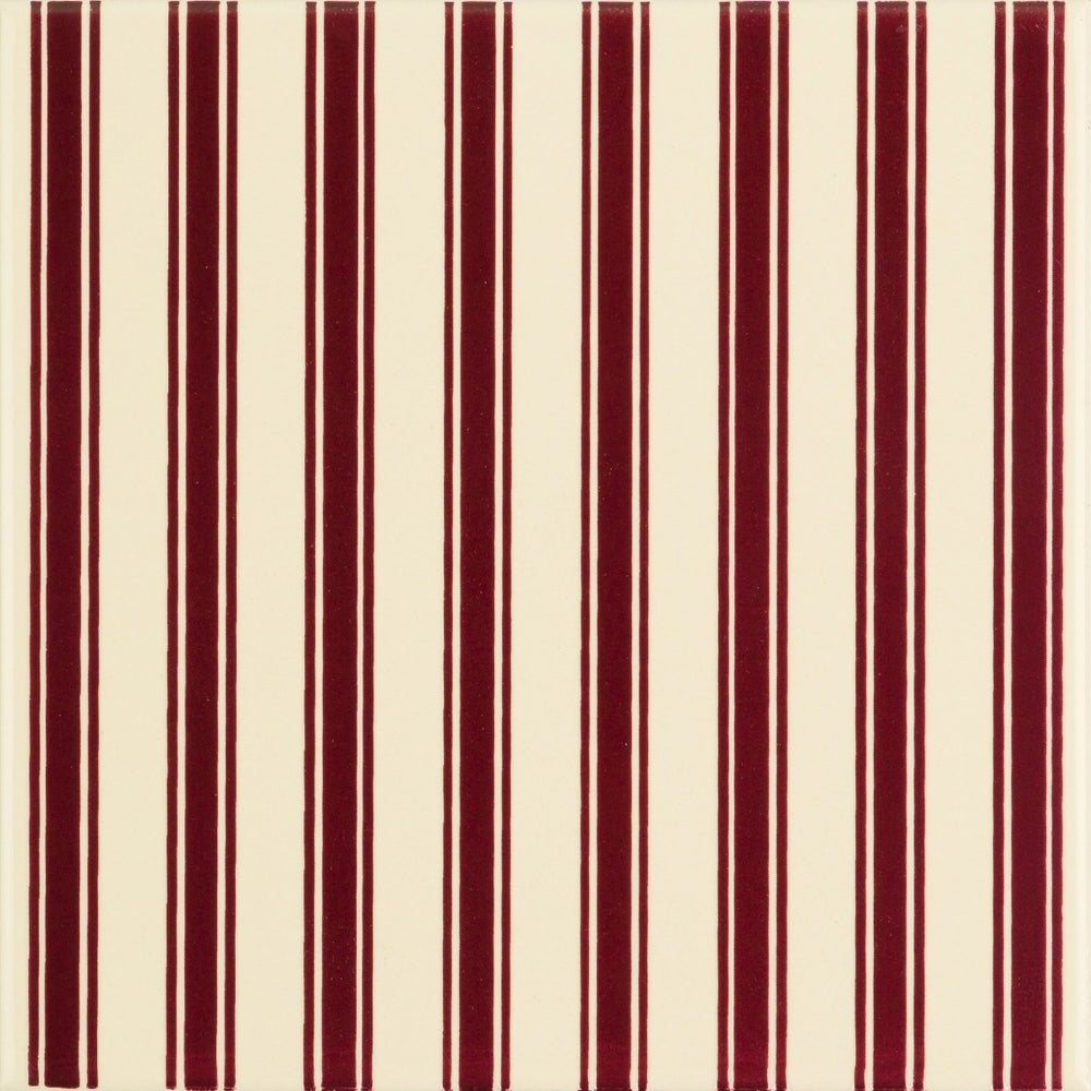 Regency Stripe in Burgundy on County White features a deep, rich burgundy stripe set against a clean County White background. The tile measures 152 x 152 x 7 mm, made of decorated ceramic with straight edges.