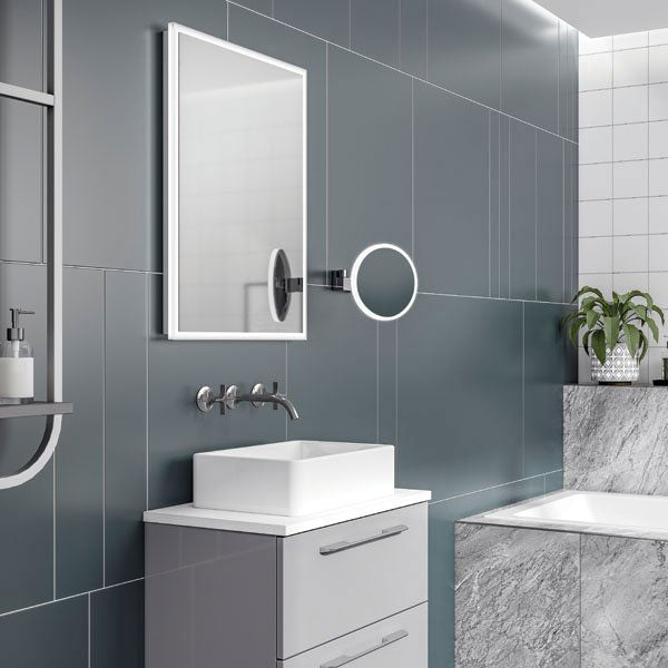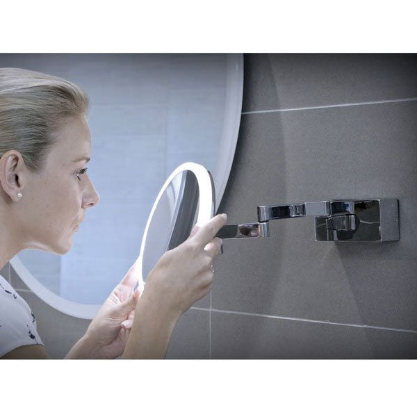 The small circular Cirque mirror features clean defined lines, 5x magnification and innovative soft-glow LED illumination. The light is activated by a touch switch that, when held down, cycles through a spectrum of cool and warm white hues. The perfect partner for delicate tasks such as eyebrow plucking or precision shaving, this unique design brings the boutique hotel to your bathroom.