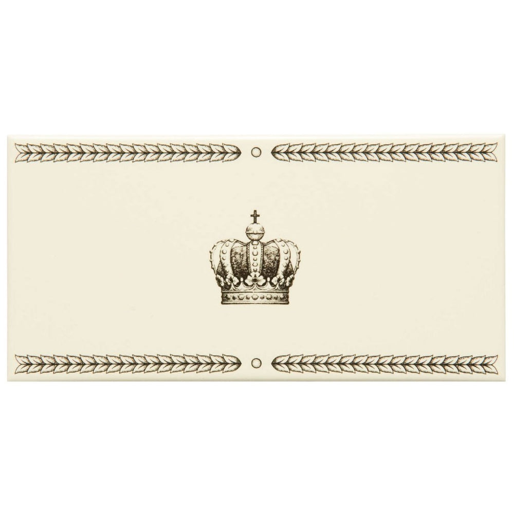 The Single Sovereign Crown tile in Charcoal Grey on County White is a 152 x 75 mm ceramic tile with a glossy finish. Featuring a central crown motif, it adds a regal touch to decorative schemes, whether used in borders or to highlight feature panels. Part of the Fabergé Artworks collection.