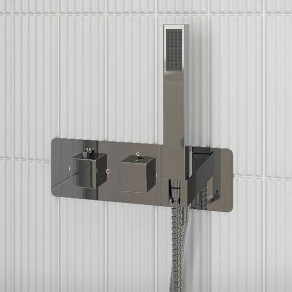 Mixer shower with a two-outlet thermostatic valve by Tabo. Includes an integrated handset and brass showerhead in a stunning chrome finish.