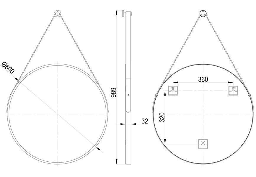 Dimensions: H 600 (989 w/strap) x W 600 x D 32mm