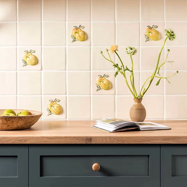 Introducing the Summer Fruits Collection, featuring hand-painted and deep-moulded decor tiles crafted to perfection. Each delicate fruit design is adorned with soft, natural colours, creating an understated yet alluring aesthetic. These tiles are expertly shaded to add depth and intricacy to your space. These beautiful designs are designed to coordinate seamlessly with our Off White Field tiles. Whether used as drop-in features or as standalone accents, these tiles offer a graceful and refined ambience to any setting.